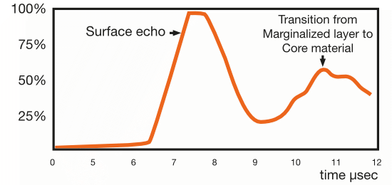 The measuring electronic records the receive-signal from test head constantly. The signal curve contains a strong surface echo, then a minimum and subsequent a more or less steep rise which results of the reflection at the transition from the marginalized layer to the core material.